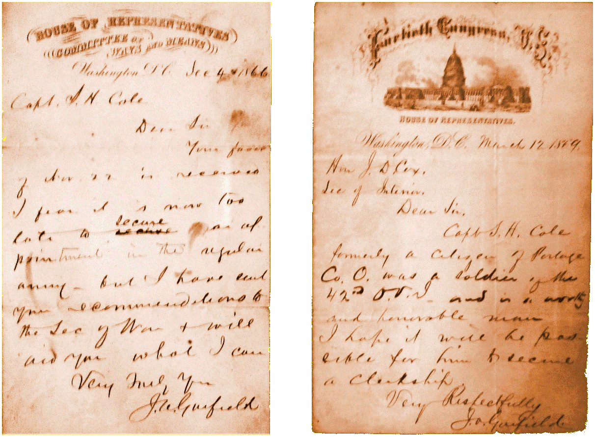 Letters from James A. Garfield written to and on behalf of Capt. Samuel H. Cole in an effort to secure Capt. Cole a government position | |