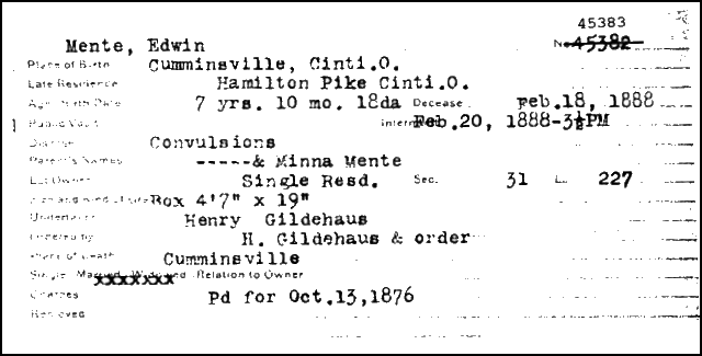 If one refers to the length of Eddie's life on his cemetery interment card above, you will note that he lived 7 years, 10 months, and 18 days. If you count that back from his date of death, February 18, 1888, it comes out to April 1, 1880, the same as on this birth record card. The speculation that the father mentioned on the birth record card, "William" is perhaps William Mente, Minnie's late husband's brother.
