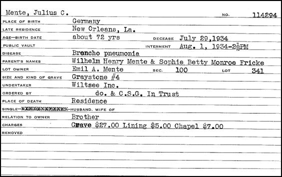 “HAROLD DANZIGER, b. 14 February 1892, New Orleans, Louisiana; d. 24 September 1957, New Orleans, Louisiana. Exeter 1909, Yale 1913. Worked at Mente & Co entire career as Mr. Mente's right hand man. Never married. Metairie Cem., Metairie, Louisiana” I then searched for Metairie Cemetery and found Mr. Danziger. He is included here, as apparently he was a very important man in the lives of Julius and Eugene Mente. | ![]() Older brother Alvin W. Mente and Jack C. Mente |