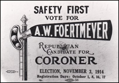 In 1914, as coroner, A.W. was very much aware of the deaths and injuries people were experiencing in automobile accidents. So, with the money alotted to him he purchased a large number of "Safety First" signs to be placed in dangerous places along the roadways. Below is a mockup of one such sign. I have only a description to go by, however, so this is just what I think it may have looked like.