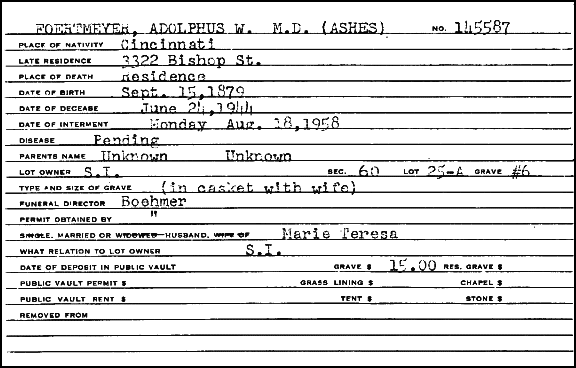Adolphus William Foertmeyer, Cincinnati; Medical College of Ohio, Cincinnati, 1905: also a pharmacist; assistant professor of psychiatry at the University of Cincinnati College of Medicine ; member of the American Psychiatric Association and the Central Neuropsychiatric Association; since January 1942 probate court alienist ; for two terms county coroner : formerly federal jail physician ; served overseas during World War I: major, medical reserve corps, U. S. Army, not on active duty; on the staffs of St. Mary's, Bethesda, Christ, Jewish, Cincinnati General, Deaconess and Good Samaritan hospitals; died June 24, aged 64.