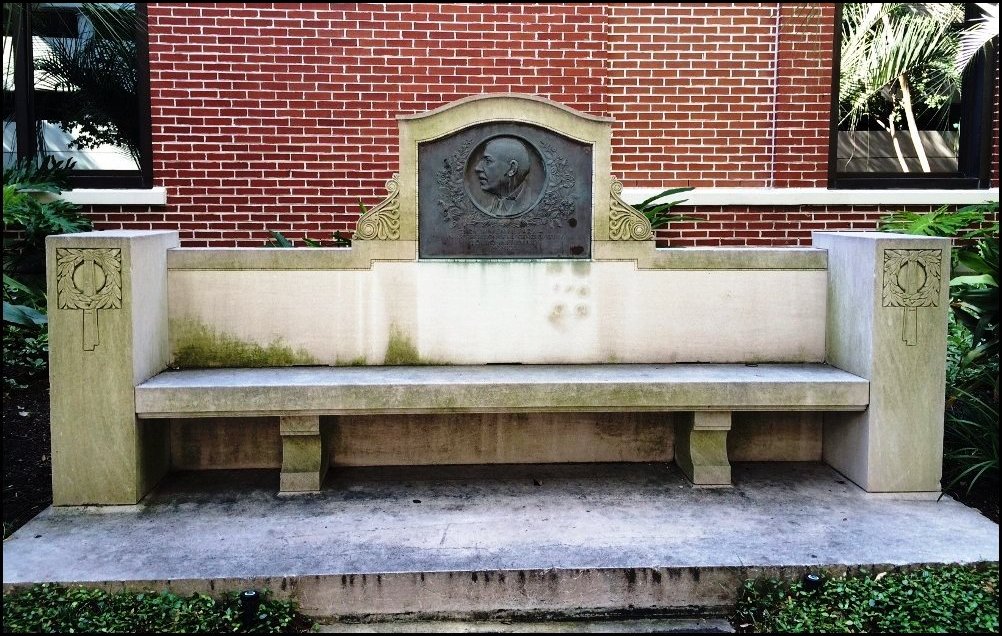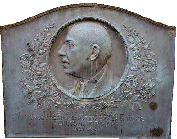 The Mente Bench is still very much a part of Touro Infirmary. It is in a garden nitch facing Prytania Street, and it has quite a history. At first there was to be a Mente ward but World War I interrupted this plan. After the War, Touro constructed the A Building across Aline Street, and the bench was placed in a Mente Park between the buildings. In 1936, Aline Street was closed so Touro could build the Bloch Pavilion, connecting the A Building with the original buildings facing Prytania, and the bench was moved into the garden nitch where it is today. The medallion with Mente’s picture is attached at the back. There is also a plaque on the building giving a short history of the bench.