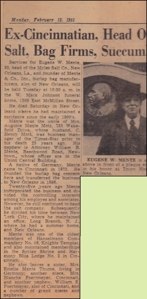 In 1919, Eugene Mente and Emanuel Benjamin bought out all interests in Myles Salt Company and became equal owners in the company and the mine. Mr. Benjamin passed away in 1934 and in Eugene Mente’s 1937 autobiography Eugene states that he was then [1937] the president of the salt company. The Myles Salt Company operated salt mines on both Avery Island and Weeks Island in Iberia Parish. The Avery Island mine passed out of Myles' hands in 1896, and the Weeks Island mine was sold to Morton Salt Co. in 1947. ![]() ![]()