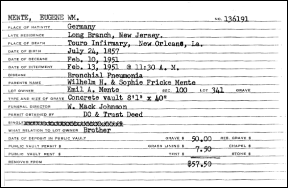 | ![]() Eugene sitting on the bench commemorating his $50,000 contribution in 1914 to Touro Hospital in New Orleans. That's $1,232,620 in 2018 dollars. "The E.W. Mente Park. In appreciation of his generosity to Touro Infirmary MCMXXV" Bronze bas relief sculpture placed on granite bench made by A. Weiblen Marble Co. Plaque which accompanied the bench is attached to the building. It reads: "In grateful appreciation of the generous benefactions of E. W. Mente this park has been named in his honor." Biographical Note: German sculptor Albert Rieker (1890-1959) studied in Munich, his native Stuttgart, and Italy. Relocating to New Orleans in 1923, he taught at the New Orleans Art School of the Arts and Crafts Club. His commissions included sculptures for the capitol in Baton Rouge and likenesses of many political and civic leaders. (THNOC catalog-The Long Weekend part II.) | ||||